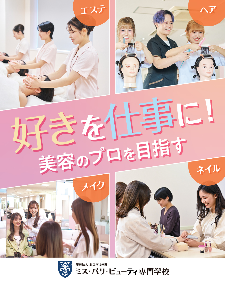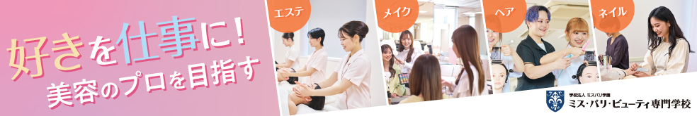 ミス・パリ・ビューティ専門学校 は、国内大手のエステティックサロンと有名ヘアサロンが作った美容専門学校で、最新の知識と技術を学べます。